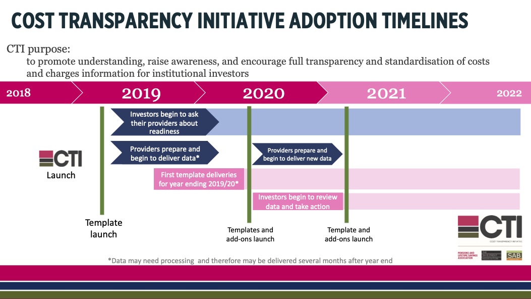 A. The CTI does not currently collect or retain cost or charges data itself - it is intended only to facilitate information requests and the collection of data from asset managers according to an industry standard. However, you may wish to speak to third party information providers who may offer data presented at aggregate level and/or benchmarking against other service providers.