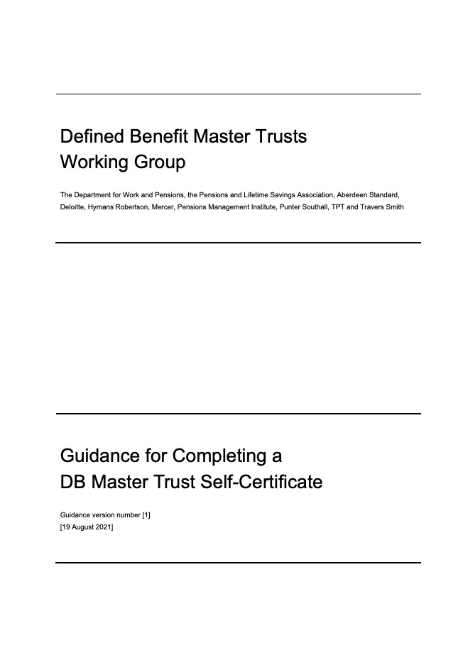 The template and guidance were both designed by the Defined Benefit Master Trusts working group, in order to raise awareness of DB Master Trusts as a consolidation option. The working group, led by the Department for Work and Pensions (DWP), also included abrdn, Deloitte, Hymans Robertson, Mercer, the Pensions and Lifetime Savings Association, the Pensions Management Institute, Punter Southall, TPT and Travers Smith.