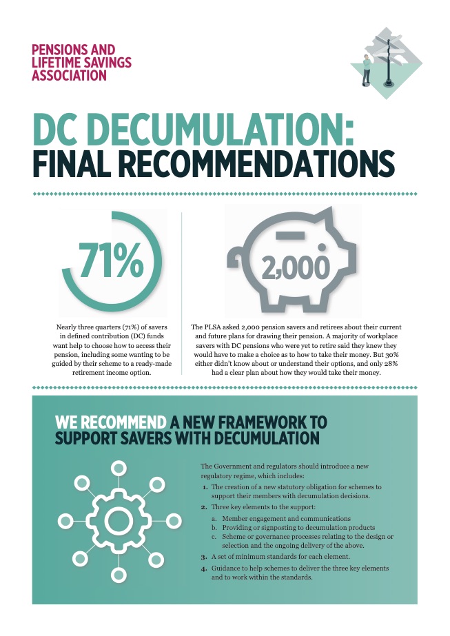 These final recommendations call for the establishment of a new regulatory framework to help savers with the complex decisions they face when choosing how to access their pension at retirement. The recommendation is being made following a three month consultation which set out the PLSA’s vision for a new Defined Contribution (DC) Decumulation framework in July. Having received widespread support, the final framework published today remains broadly unchanged, though some of the detail has been enhanced, refined, clarified and added to.