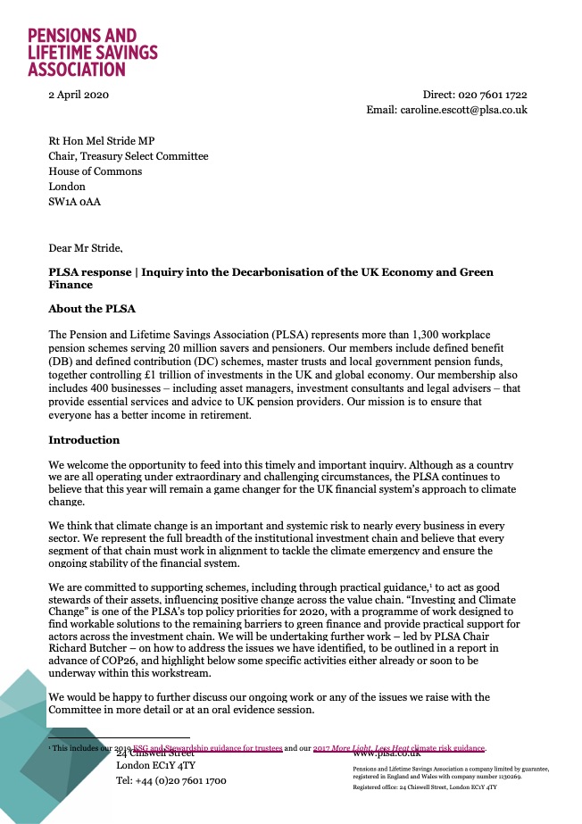 PLSA response to the Treasury Select Committee Inquiry into the Decarbonisation of the UK Economy and Green Finance