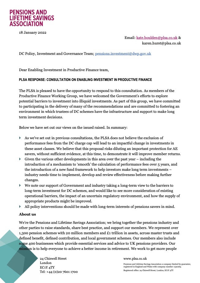 The PLSA welcome the Government’s efforts to explore potential barriers to investment into illiquid investments, however, we are not supportive of the exclusion of performance fees from the DC charge cap. We believe this proposal risks diluting an important protection for AE savers, without sufficient evidence at this time to demonstrate it will improve member returns.