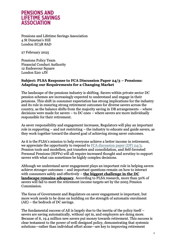 The PLSA has submitted a response to FCA Discussion Paper 24/3, which explores how regulatory requirements should evolve to reflect the changing pensions landscape. As the industry moves further towards DC schemes, saver engagement and responsibility are increasing, making clear and effective regulation crucial.
