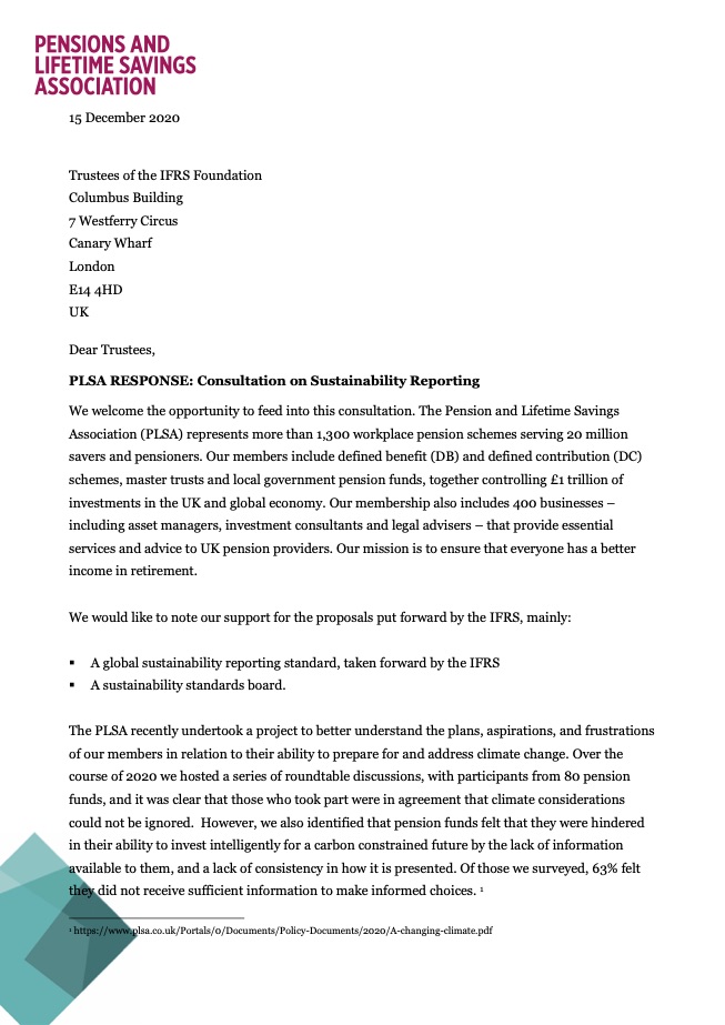 International sustainability standard and board: PLSA response to IFRS Foundation consultation
