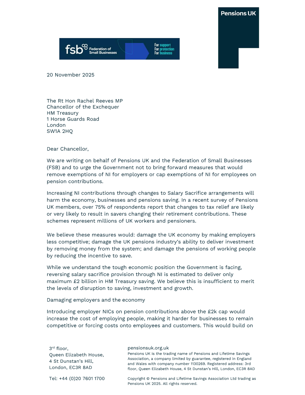 Pensions UK and the Federation of Small Businesses (FSB) have sent a joint letter to the Chancellor urging her not to introduce changes to salary sacrifice or wider pensions tax relief in the forthcoming Budget.