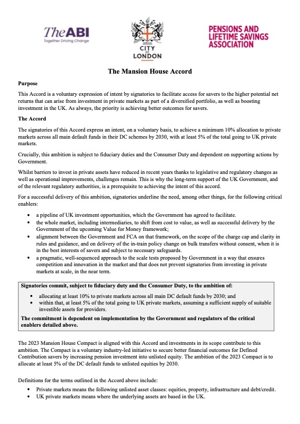 The voluntary initiative, to be known as the Mansion House Accord, has been jointly led by the Association of British Insurers (ABI), Pensions UK, (previously the Pensions and Lifetime Savings Association), and the City of London Corporation. It is aimed at securing better financial outcomes for DC savers through the higher potential net returns available in private markets, as well as boosting investment in the UK.
