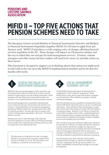 The European Union’s revised Markets in Financial Instruments Directive and Markets in Financial Instruments Regulation (together MiFID II) will start to apply from 3rd January 2018. MiFID II introduces a wide-ranging series of changes affecting financial services regulation in the EU. These changes will impact on UK pension schemes and the way in which they use and pay for fund management services. Trustees, scheme managers and other senior decision-makers will need to be aware of, and take action on, these issues.