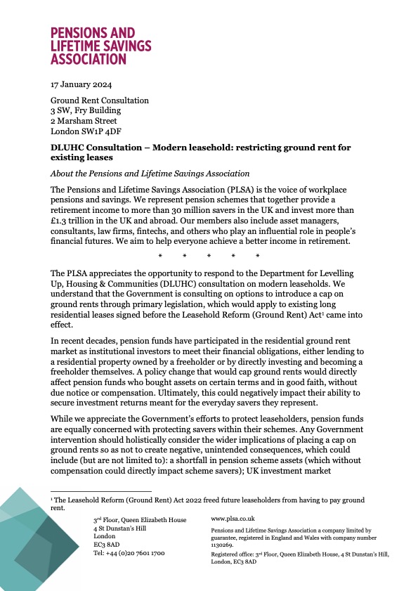 The PLSA responded to the consultation, recommending that any Government intervention holistically consider the wider implications of placing a cap on ground rents to avoid negative, unintended consequences, which could include (but are not limited to): a shortfall in pension scheme assets (which without compensation could directly impact scheme savers); UK investment market reputational damage and decreased investor appetite in residential markets; and freeholder insolvencies that could ultimately harm leaseholders.