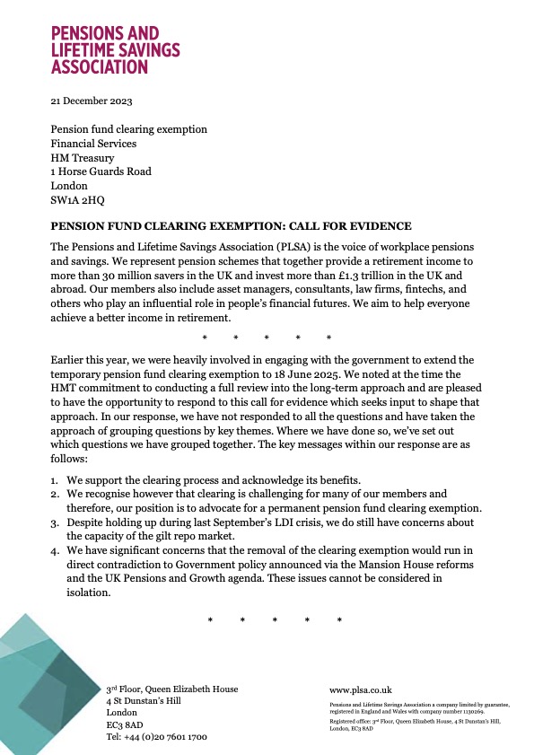 Pension fund clearing exemption – PLSA response to HMT call for evidence