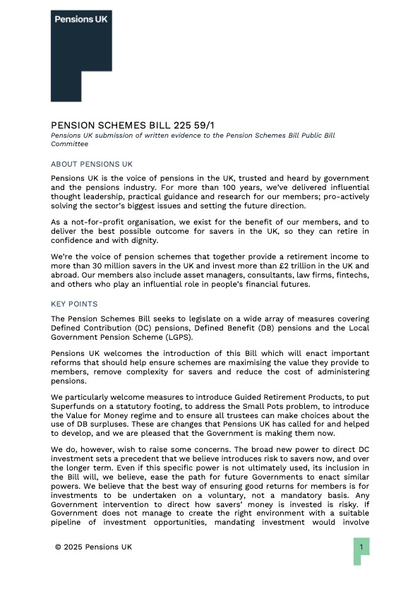 Pensions UK response to the Pensions Schemes Bill Committee call for evidence. The Pensions Schemes Bill seeks to legislate on a wide array of measures covering Defined Contribution (DC) pensions, Defined Benefit (DB) pensions and the Local Government Pension Scheme (LGPS).