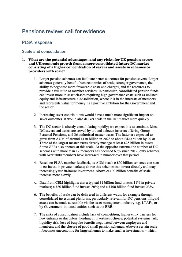Pensions Review – PLSA response to call for evidence