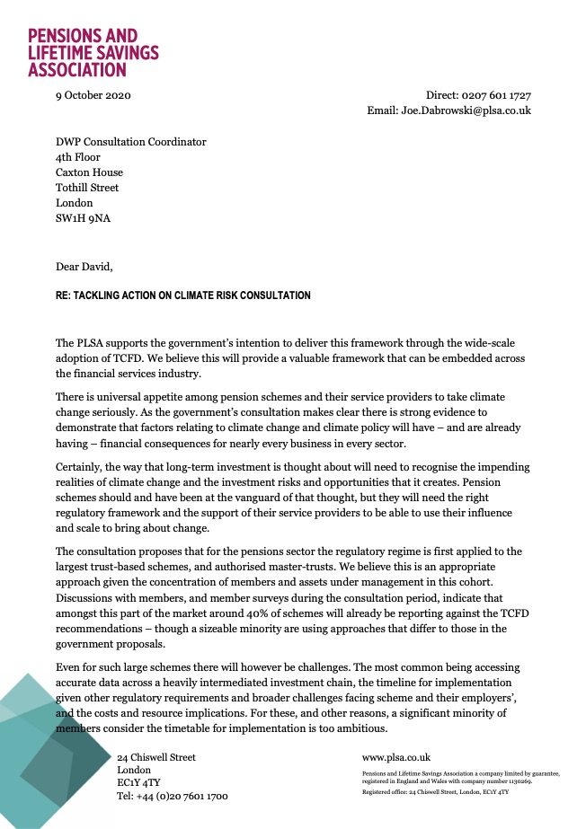 Taking action on climate risk: Improving governance and reporting by occupational pension schemes: PLSA response