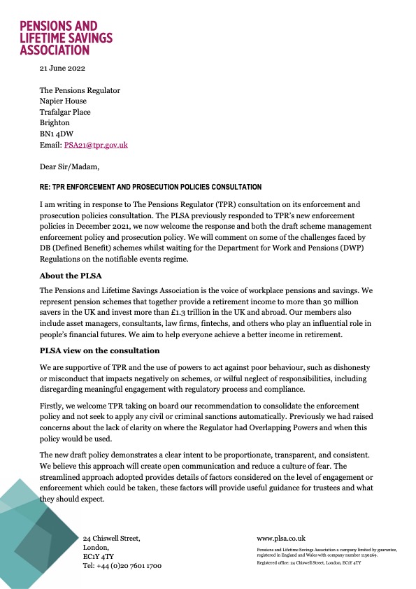 In May 2022, The Pensions Regulator published a new consultation on enforcement and prosecution policy. We welcome the response from the Regulator including taking on board our recommendation to consolidate the enforcement policy, as included in our response in Autumn 2021 to their intial consultation.
