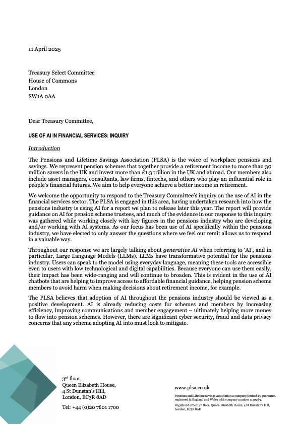 The PLSA has submitted a response to the Treasury Select Committee's inquiry into use of AI in Financial Services, which explores the potential impacts of the increased use of Artificial Intelligence (AI) in banking, pensions and other financial services.