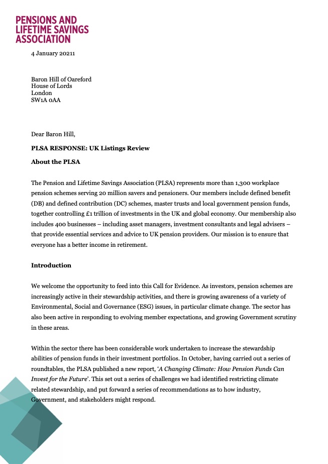 UK listings review call for evidence: PLSA response