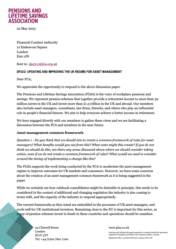 Updating and Improving the UK Regime for Asset Management: PLSA response to the FCA Discussion Paper